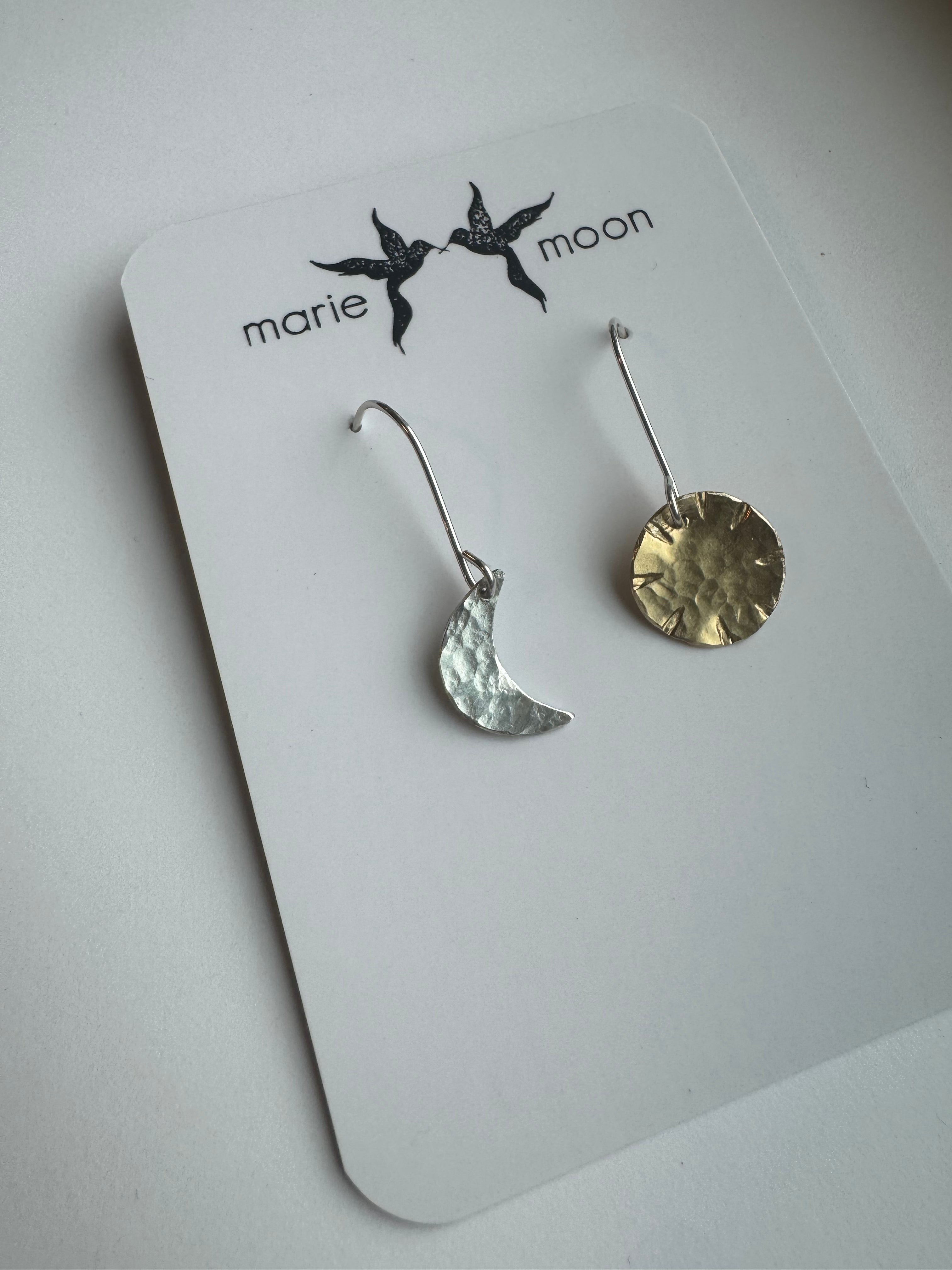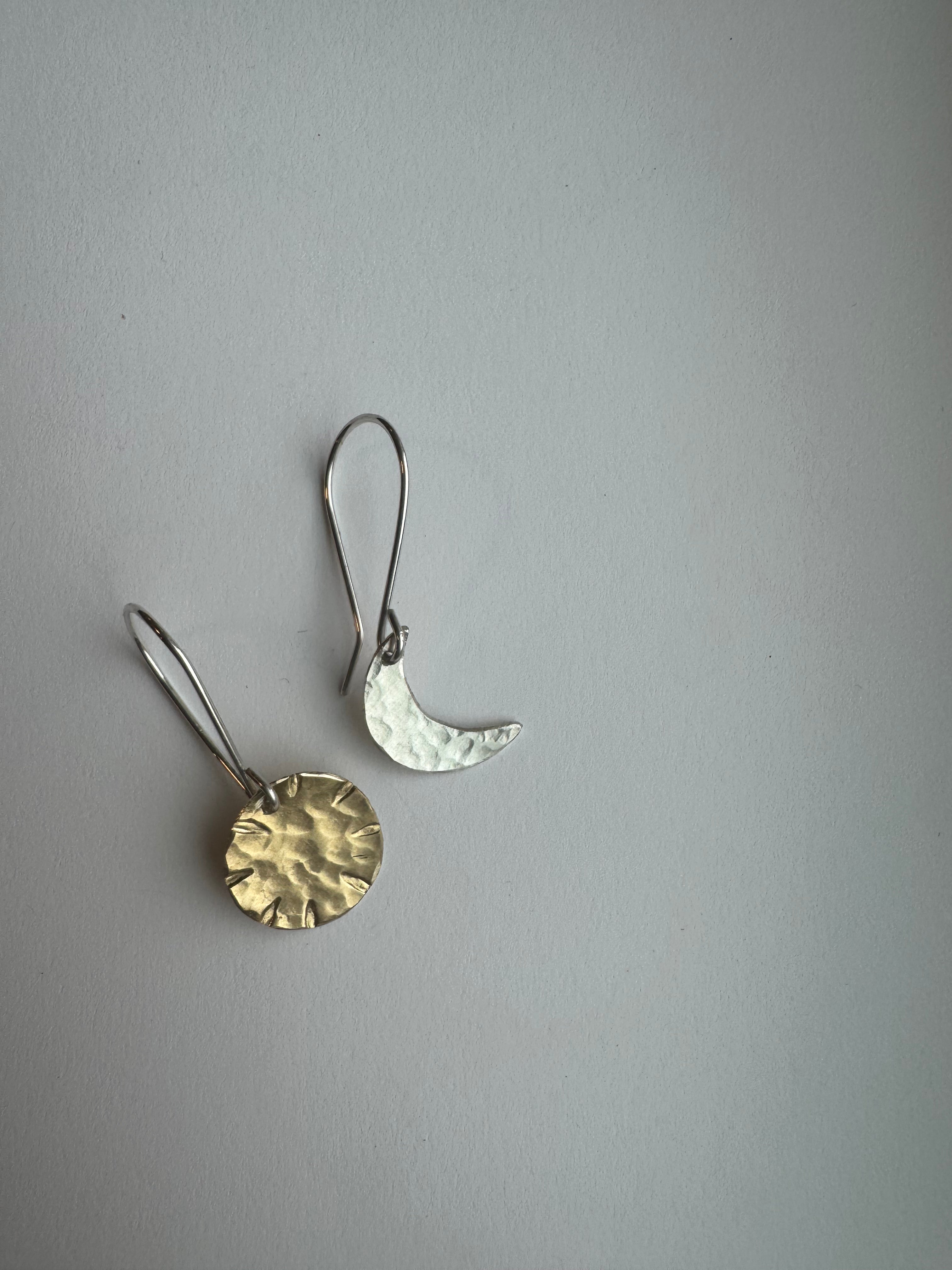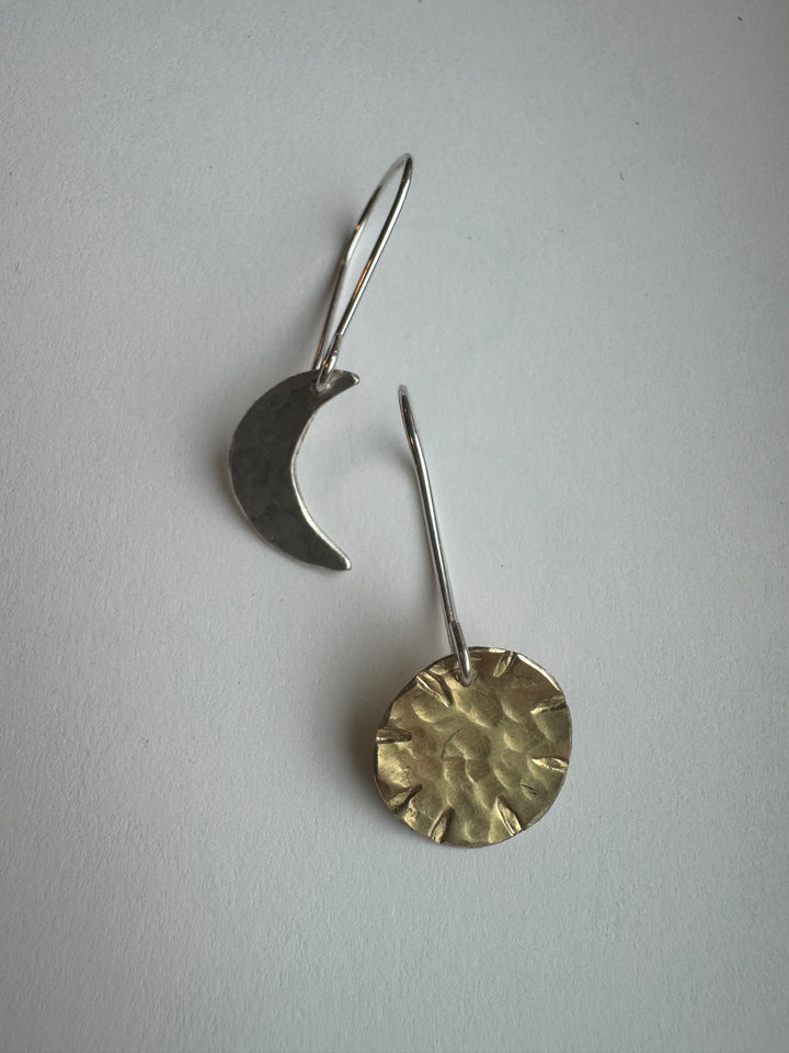 - Materials: Hammered Brass (Sun) and Hammered Sterling Silver (Moon)