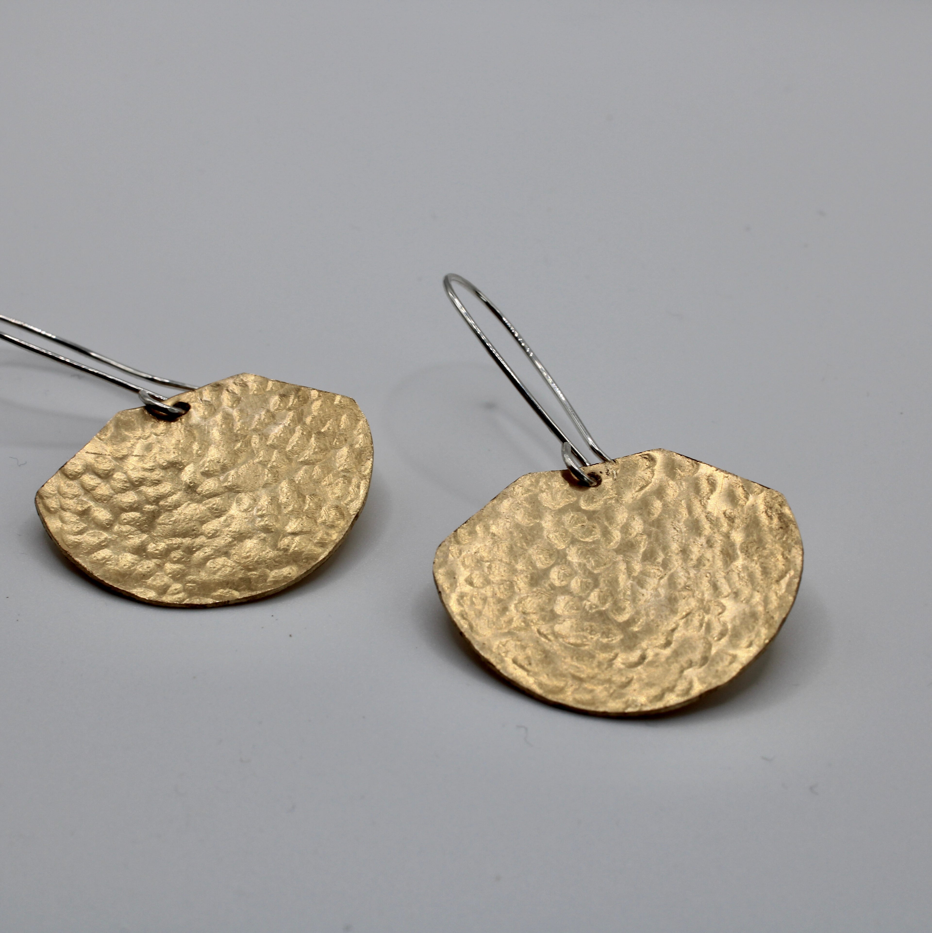 Handmade hammered brass "Una Earrings" with Sterling Silver earring hooks for sensitive ears.